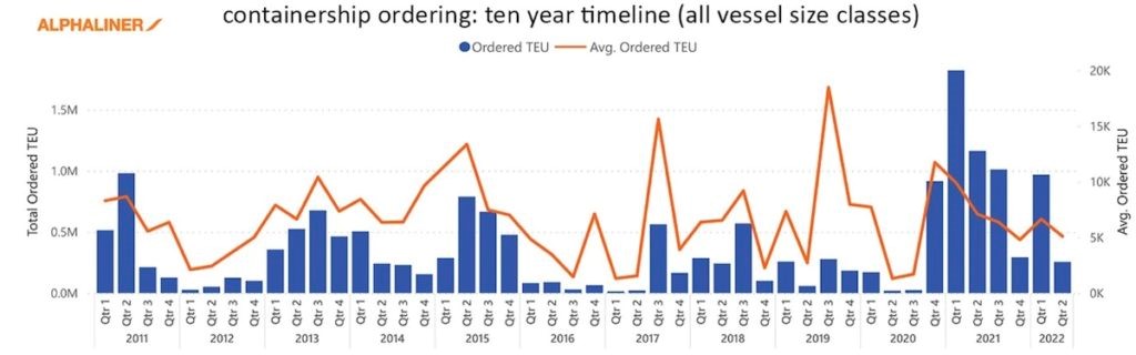 According to Alphaliner, the pipeline of container newbuildings is bigger than the combined existing fleets of Cosco, Hapag-Llod and Evergreen, the world’s fourth, fifth and sixth largest liners, respectively.