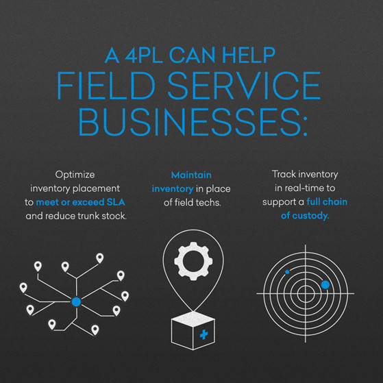 Các công ty có hoạt động dịch vụ hiện trường rộng lớn, bất kể họ là nội bộ nghiêm ngặt hay cung cấp dịch vụ cho khách hàng, sẽ được hưởng lợi từ quan hệ đối tác với 3PL. Một môi trường dịch vụ thực địa khác với một tình huống sản xuất và đòi hỏi các giải pháp độc đáo. Đáp ứng kỳ vọng thỏa thuận cấp dịch vụ (SLA) là rất quan trọng đối với sự hài lòng của khách hàng và một chương trình triển khai phía trước được quản lý tốt có thể đảm bảo các tiêu chuẩn được đáp ứng hoặc vượt quá.