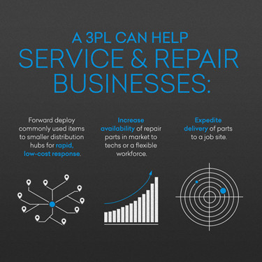 Để đáp ứng những kỳ vọng cao này, 3PL có thể triển khai các mặt hàng thường được sử dụng trong các trung tâm phân phối nhỏ hơn để đáp ứng nhanh chóng, chi phí thấp hơn. 3PL có thể phát triển cơ sở dữ liệu của các mặt hàng được đặt hàng thường xuyên nhất và đảm bảo hàng tồn kho được quản lý để đáp ứng nhu cầu liên tục. Có sẵn phần phù hợp khi kỹ thuật viên dịch vụ thực hiện cuộc gọi ban đầu sẽ góp phần vào mức độ hài lòng cao của khách hàng. Công nghệ dịch vụ có thể dừng lại ở trung tâm để nhận các bộ phận hoặc đặt hàng giao hàng nhanh đến trang web việc làm.