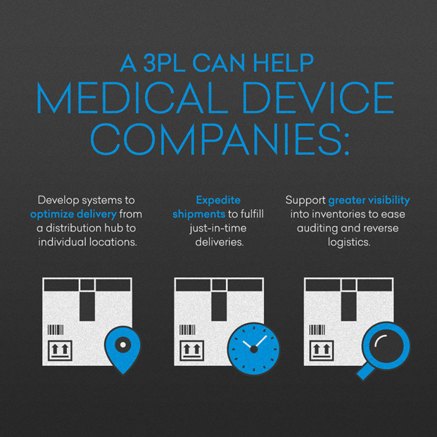 3PL có thể giúp một công ty thiết bị y tế phát triển các hệ thống để tối ưu hóa việc phân phối từ một trung tâm phân phối đến các địa điểm riêng lẻ. Thay vì giao nửa tá mặt hàng trong nhiều lô hàng, 3PL có thể phát triển khả năng hiển thị để hợp nhất việc giao hàng để giảm chi phí đáng kể. 3PLs có thể quản lý các lô hàng nhanh để thực hiện giao hàng đúng lúc cho các mặt hàng có giá trị cao. Khả năng hiển thị lớn hơn vào hàng tồn kho và logistics đảo ngược cải thiện tính dễ kiểm toán, giảm nhu cầu kiểm toán vật lý.