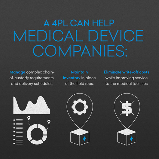 Bạn có biết rằng đôi khi các bác sĩ phẫu thuật yêu cầu một thiết bị y tế như thay khớp gối chỉ sau khi bệnh nhân đã bắt đầu quá trình gây mê? Nói về giao hàng đúng lúc. Các bác sĩ phẫu thuật có thể yêu cầu một số kích thước của một sản phẩm vì họ không biết chính xác họ sẽ cần cái nào khi bắt đầu thủ thuật. Một 4PL có thể quản lý chuỗi phức tạp của các yêu cầu lưu ký và lịch trình giao hàng để đáp ứng các yêu cầu của bác sĩ và giảm chi phí hàng tồn kho.