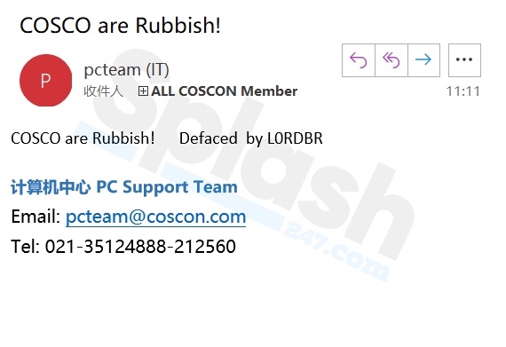 Một tin tặc người Brazil có tên L0RDBR đã xâm nhập vào hệ thống email của Cosco vào thứ Bảy. Khi được Splash liên hệ, một nguồn tin tại trung tâm CNTT của Cosco đã xác nhận rằng hệ thống email đã bị tấn công và nó vẫn đang được khắc phục. Không có con số thời gian cụ thể bao lâu để giải quyết được đưa ra.